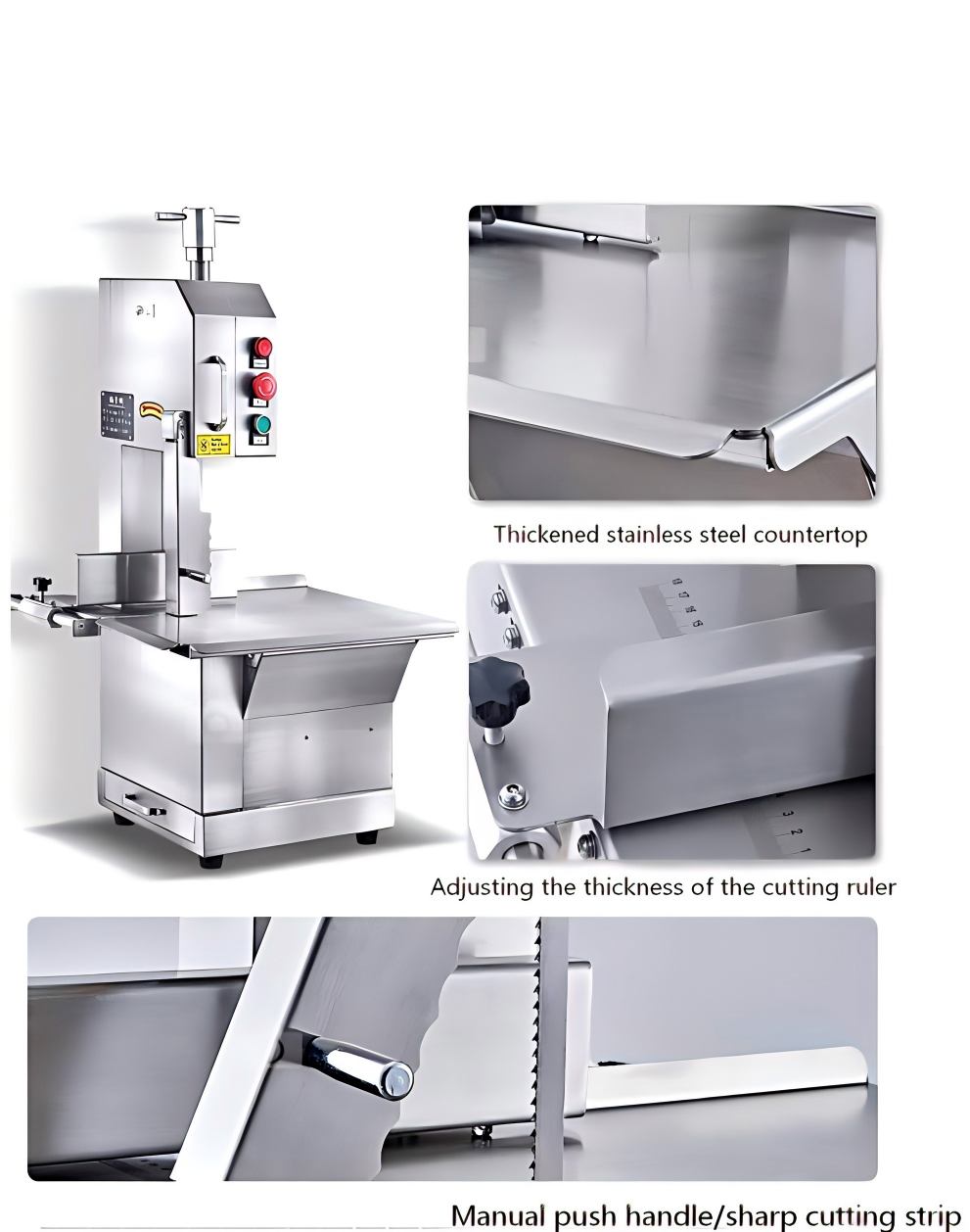Commercial bone saw machine with stainless steel body, pure copper motor, and safety features. Available in 3 models for small to large-scale meat/bone cutting. Ideal for butcher shops, restaurants, and food factories.